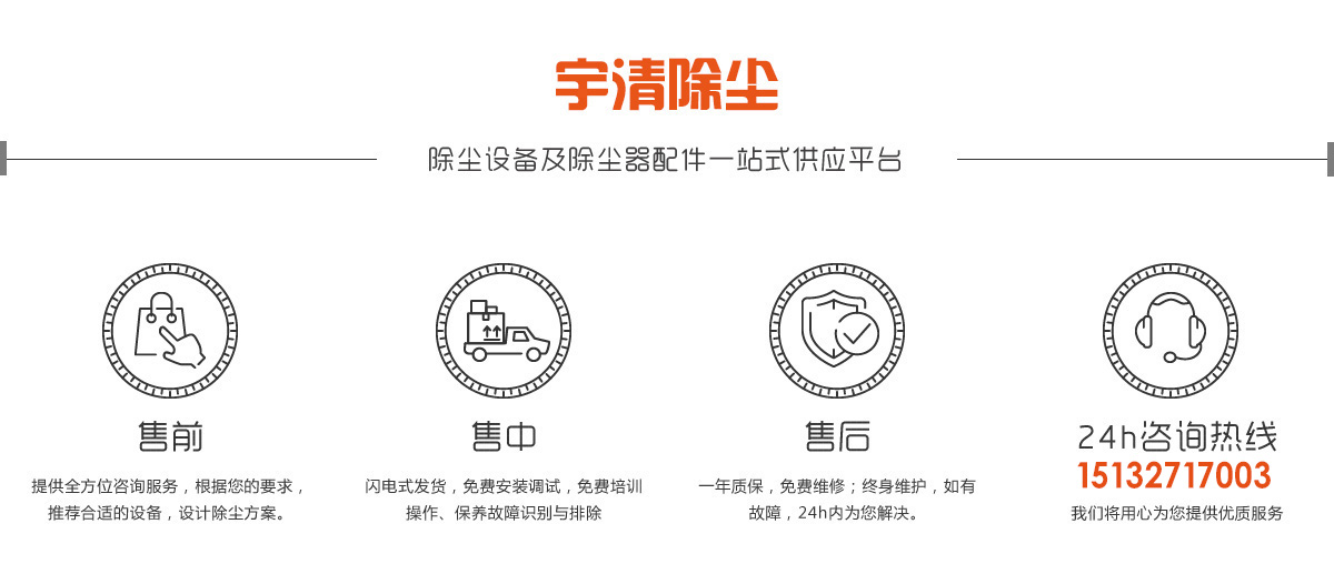 宇清除塵設備有限公司擁有多年布袋除塵器及配件的生產經驗,公司擁有好的生產設備,標準化的生產工廠, 以“實體生產,保證貨源,售后無憂”的經營理念服務廣大客戶。